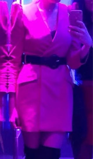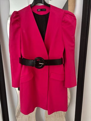 Vestido estilo blazer en color fucsia de Zara. Se incluye cinturón. Destaca por sus mangas abullonadas y un cinturón negro con hebilla redonda que marca la cintura. - Diseño cruzado. - Bolsillos de solapa. - Mangas largas abullonadas. El color es fucsia, en las fotos sale el color más melocotón
