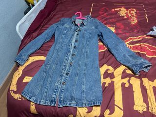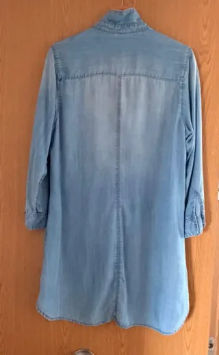 Vestido estilo camisero de tela vaquera. De sisa a sisa mide 52cm, de largo mide 90cm - Diseño de corte recto. - Dos bolsillos en la parte delantera. - Mangas largas con puño. - Cuello camisero.