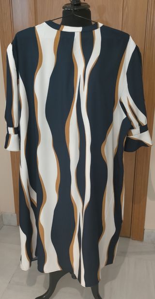 Es una prenda súper favorecedora y cómoda. Tiene un corte en línea "A" con vuelo ligero, largo hasta la mitad del muslo, mangas ligeras y un efecto fajín en la cintura creando un efecto de talle alto que estiliza la figura. Es un vestido versátil que combina elegancia y comodidad. Es seminuevo, me lo puse 2 veces.