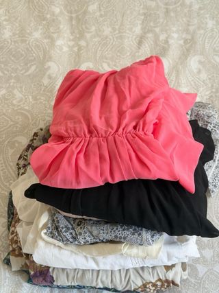 Lote con 19 vestidos de estilo variado y de diferentes marcas. Variedad de cortes, estampados y tejidos, ideales para diferentes ocasiones, incluyendo, principalmente, diseños casuales para el día a día, pero también opciones más formales. Base de colores neutros con algunos vestidos de color, como rojo, fucsia y tonos cálidos (mostaza/melocotón). Todas las prendas se encuentran en buen estado. Han sido cuidadas y están listas para una segunda vida. Tallas variadas, de la S a la XL, pero principalmente el rango 38-40. Vendo el lote completo para facilitar la gestión y porque necesito liberar el espacio urgente.