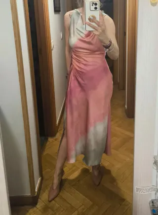 Elegante vestido largo de Zara con un diseño degradado en tonos rosas y grises. Su tejido satinado y drapeado lateral le otorgan un estilo sofisticado. - Diseño asimétrico. - Detalle de fruncido lateral. - Largo midi.