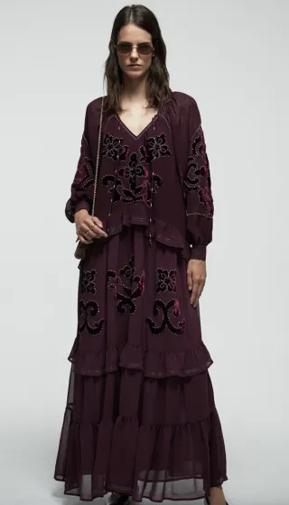 Vestido largo estilo boho con bordados y volantes. - Color berenjena con detalles dorados. - Diseño con bordados florales y ornamentales. - Mangas largas abullonadas. - Varios niveles de volantes en la falda.
