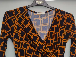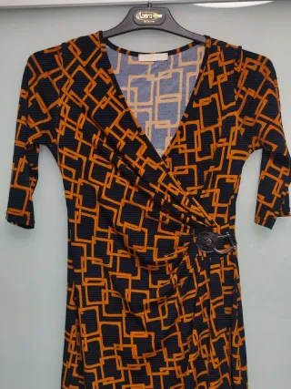 Vestido de la marca Promod con un estampado geométrico llamativo. - Diseño cruzado con detalle de hebilla. - Mangas tres cuartos. - Tejido elástico para mayor comodidad. - Se ajusta perfectamente al cuerpo. - Lavado en lavadora 30° no necesita plancha. - Muy cómodo y estiloso