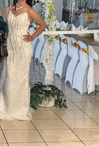 Elegante vestido fiesta coleccion invitada de la marca pronovias. Estilo sirena ajustado con algo de cola y pedreria en el pecho y espalda. Detalle abotonado por la espalda. Atado por detras con cremallera. Precio original 800€ Altura 1,66 cm y tacones Un solo uso