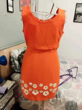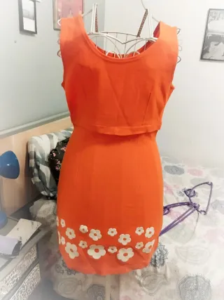 Vestido de estilo retro con un diseño encantador de flores. - Color principal naranja vibrante. - Adornado con apliques de flores blancas. - Diseño de corte recto.