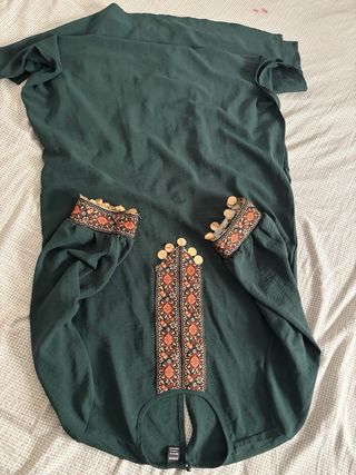Precioso kurta de estilo pakistaní o indio, ideal para ocasiones casuales. Presenta un diseño llamativo y está en buen estado. - Cuello redondo con detalle bordado. - Mangas largas con puños adornados. - Adornos dorados en el cuello y puños. solo gente de pamplona