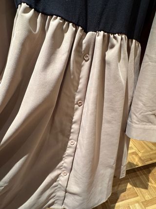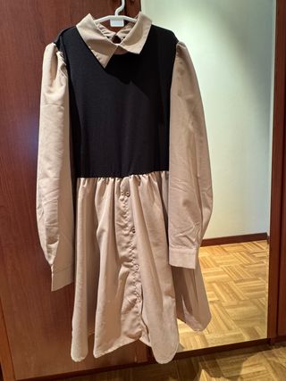 Vestido estilo camisa con contraste de colores. - Mangas largas abullonadas. - Cuello camisero. - Detalle de botones frontales.