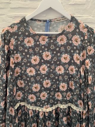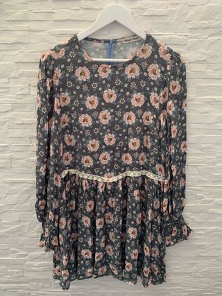 Vestido estilo babydoll con estampado floral. - Diseño de manga larga. - Detalle de encaje en la cintura. - Puños con volantes. - corte amplio no queda encajado al pecho - puede valer para una talla más - puesto 1 vez