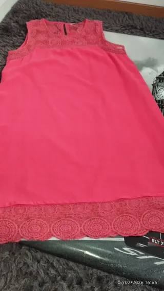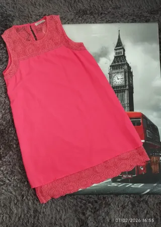 Vestido recto sin mangas en color coral, que se distingue por sus detalles de encaje tipo blonda tanto en el escote como en el bajo. *Estilo: inspiración vintage, similar a la moda "go-go" de los años 60. *Material: 80% Poliéster, 10% poliamida y 10% algodón. (Forro: 100% poliéster). *Diseño: Cuello redondo con panel superior de encaje calado y un remate circular de encaje en el dobladillo inferior. *Talla 42. *Perfecto estado. #vestidos #talla42 #mdm