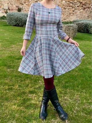 Vestido de estilo indie con un estampado de cuadros clásico. El diseño presenta un corte que favorece la figura y una falda con vuelo. Está puesto solo para la foto. - Mangas tres cuartos con detalle de botones. - Cuello redondo. - Largo hasta la rodilla. #indie #vestidos #cuadrosvichi #mediamanga #rockstyle