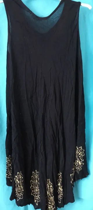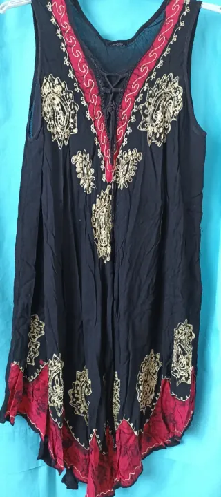 Vestido de estilo hindú con un diseño llamativo. - Estampado paisley dorado. - Detalle de cordones en el escote. - Borde inferior con diseño tie-dye.