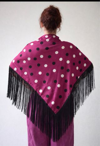 Precioso mantón de estilo flamenco confeccionado de forma artesanal por modista de Salamanca. Tela satinada color fucsia intenso con lunares blancos y negros y flecos largos negros, que le dan un movimiento espectacular. ✨ Pieza única y personalizada ✨ Perfecto para ferias, flamenco, eventos o estilismos especiales ✨ Se puede llevar tradicionalmente o incluso cruzado tipo vestido para looks creativos El tejido tiene un brillo precioso y los flecos tienen mucha caída, ideal para lucir en movimiento. Estado: muy bueno. Pieza muy especial difícil de encontrar. 💃 Ideal para amantes del flamenco, baile o moda española.