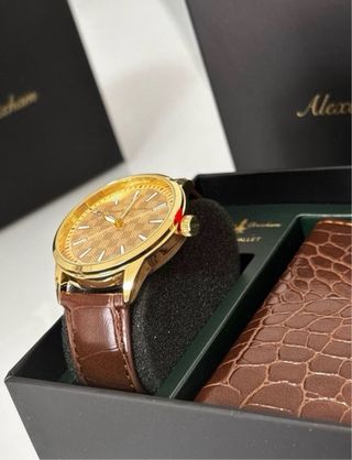 Vendo set Alexander Brixham de reloj y cartera en color marrón y dorado. Diseño elegante y clásico, perfecto para uso diario o para vestir. Características generales⌚️ ✅Set elegante de reloj + cartera a juego. ✅Colores marrón y dorado, que transmiten un estilo clásico y sofisticado.