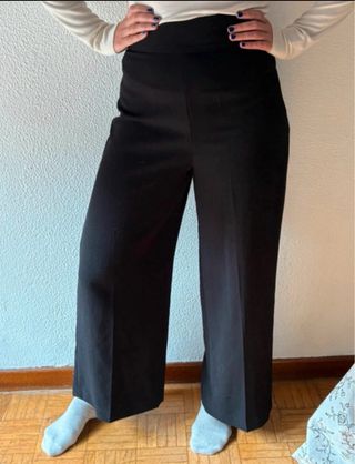 Pantalón negro de vestir de Zara, talla S, de tiro medio. Puesto una sola vez en fin de año, costó 40€ nuevo. Equivale a una talla 36 aproximadamente. Perfecto para ir a trabajar o darle un toque elegante a un outfit. Tiene cremallera invisible para atarlo en la parte izquierda. Vendo porque me queda pequeño.