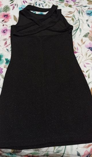 Vestido de fiesta entallado y elástico, de manga sisa con tira al cuello y tiras cruzadas en la espalda. La tela tiene brillitos color plata. vestido adecuado para fin de año. Usado solo una vez.