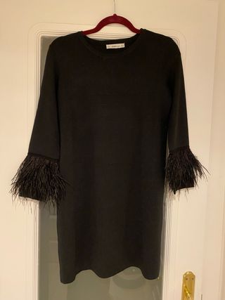 Vestido negro brilli brilli y plumas. Perfecto para navidad, Noche vieja, fin de año, etc. Punto.