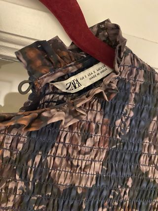 Vestido mini estampado de Zara, año 2021, en tono khaki con print leopardo. Tiene escote en pico, tirantes finos cruzados en la espalda y elástico tipo nido de abeja en la parte trasera, lo que hace que se adapte muy bien al cuerpo. Bajo acabado en volante, femenino y favorecedor. Cierre lateral con cremallera oculta. Ideal para verano, vacaciones, cenas, fiestas o looks arreglados con sandalias o tacón. 🪡 Estado: muy bueno / poco uso 📏 Talla: xs 👗 Marca: Zara