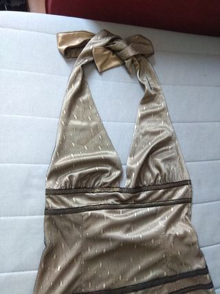 Solo se ha usado una vez, es precioso!! Vestido color dorado con rejilla negra,tacto tipo seda,talla S,cogido al cuello con aberturas en los laterales. ☆☆Graduación,boda,cóctel,fin de año,fiesta,cena de navidad ●Entra en mi perfil para ver más ofertas!!! Casi todo nuevo●