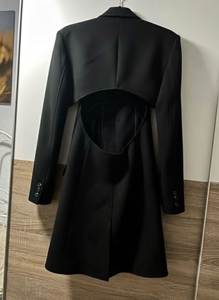 terciopelo negro con dibujos que solo se aprecian con el movimiento de la tela. Detalle abierto en la espalda y refuerzo en la zona del pecho para poder ir Topless. Súper elegante. Ideal noche vieja/fin de año. Una sola puesta.
