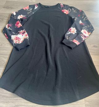 Vestido premamá con un diseño moderno y cómodo. - Mangas con estampado floral. - Cuerpo principal en color negro. - Talla 36