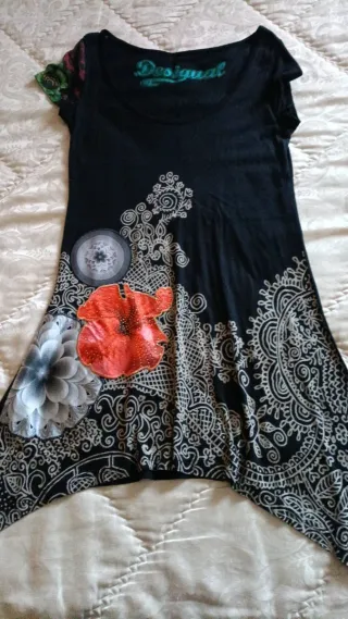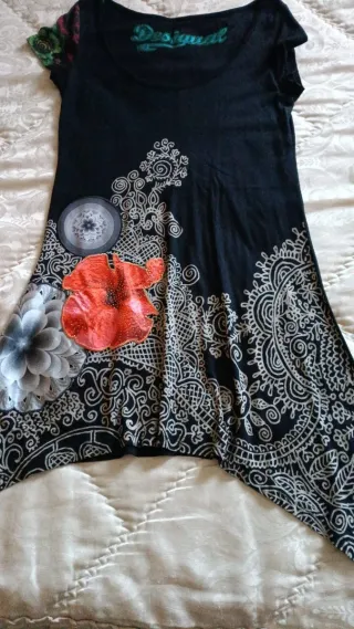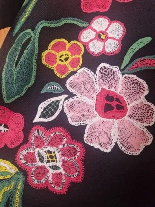 Vestido de la marca Desigual con un diseño llamativo. - Estampado floral y ornamental en blanco. - Detalle de flor roja con abalorios. - Mangas cortas. - Cuello redondo.