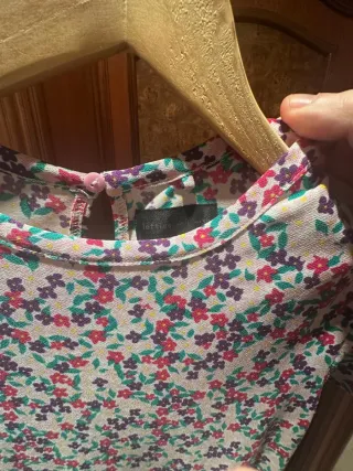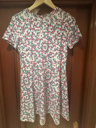 Vestido de Lefties con un bonito estampado floral. - Diseño de manga corta. - Cuello redondo. - Estampado de flores pequeñas en tonos morados, rosas y verdes sobre fondo blanco.