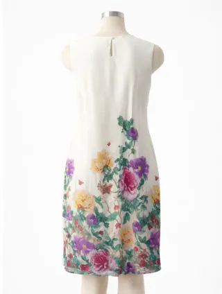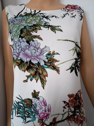 Vestido sin mangas con un bonito estampado floral sobre fondo blanco. - Diseño con flores y ramas. - Corte recto. Talla U De axila a axila mide 55cm MAS ARTÍCULOS EN MI PERFIL GRANDES DESCUENTOS EN LOTES SE PUEDE ENVIAR POR WOLAPOP