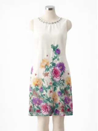 Vestido de verano con bonito estampado floral. - Diseño sin mangas. - Estampado de flores y mariposas. -Doble forro. -Con detalles de piedritas incrustadas.