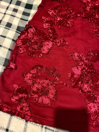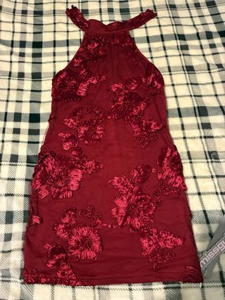 Vestido de corte ajustado con un diseño floral en relieve.Talla Xs y S - Escote halter. - Tejido de malla con aplicaciones. - Color rojo intenso.