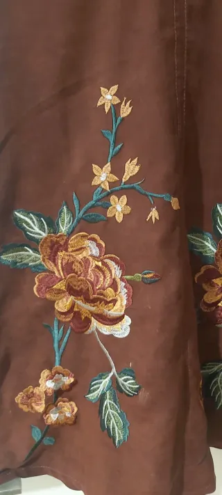 Vestido de corte entallado con un bonito bordado floral en la parte inferior. - Diseño con escote en pico y detalle. - Mangas cortas. - Bordado de flores en tonos anaranjados y marrones.