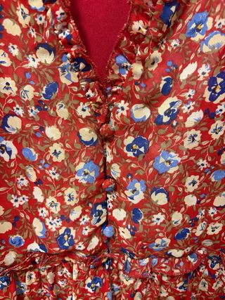 Vestido con estampado floral en tonos rojos y azules. Presenta un diseño con cuello en V y manga larga. - Estampado de flores pequeñas. - Detalle de volantes en el cuello. - botones de adorno en la parte delantera.