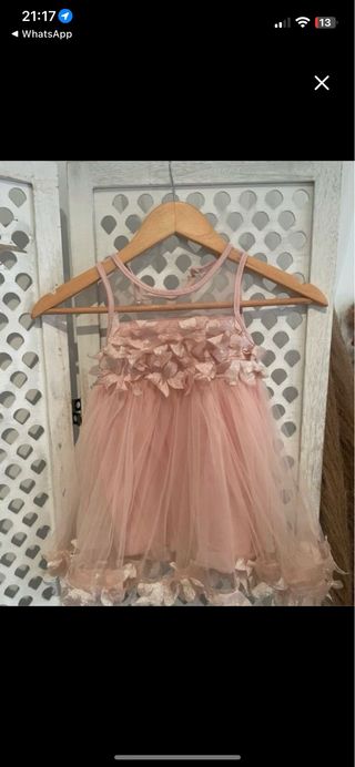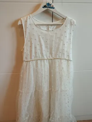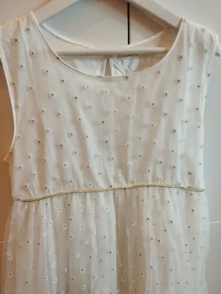 Vestido de fiesta para niña, ideal para ocasiones especiales. Presenta un diseño delicado y elegante. - Talla: 11-12 años. - Detalle de pequeñas flores y brillos. - Cintura adornada con una fina tira dorada. - Ideal para celebraciones: bautizos, comuniones, bodas...