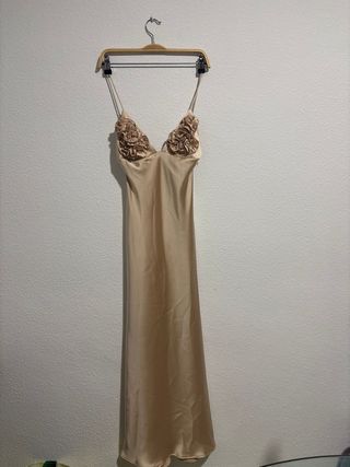 Elegante vestido largo de seda con un delicado detalle de flores en el escote. - Tejido satinado. - Tirantes finos. - Diseño largo y fluido.