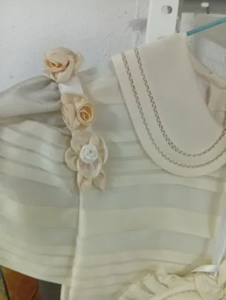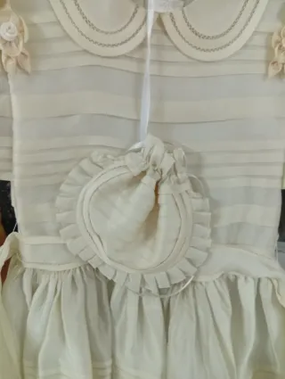 Vestido de comunión en tono beige, con detalles florales. - Diseño con cuello - Adornos de flores de tela en la parte delantera - Tejido con finas rayas verticales