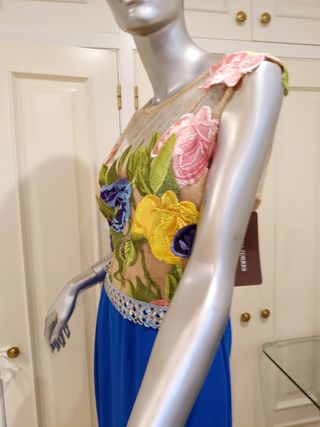 Conjunto de dos prendas: un vestido largo y un corpiño. - Vestido largo con detalle de flores en la cintura y manga acampanada. - Corpiño con estampado floral y tirantes adornados.