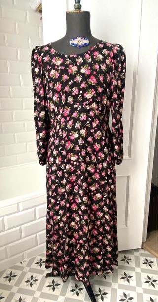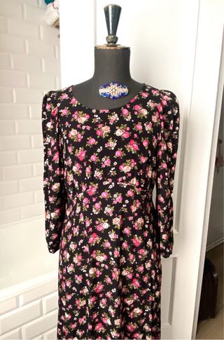 Vestido largo de estilo vintage con estampado floral. mangas abullonadas y espalda cruzada, estilo retro elegante perfecto para eventos o looks boho! Tela ligera suave (posible viscosa o mezcla floral), corte holgado oversize talla M/L, largo hasta tobillo. Excelente estado, sin manchas ni rotos, lavado reciente. Sin marca visible, calidad premium vintage. Medidas : largo 120cm, axila axila 50 cm, hombro a hombro 38 cm y largo de manga 55 cm - Diseño con manga larga. - Cuello redondo. - Estampado de flores rosas sobre fondo negro.