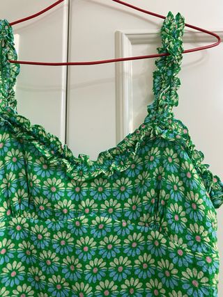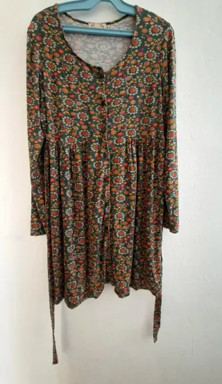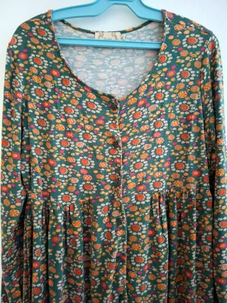 Vestido camisero con estampado floral sobre fondo verde. Presenta un diseño con botones en la parte frontal y un cinturón a juego. Es la talla 42 pero da de sí para una 44. Es de tela gruesa con caída. Moda realizada en España. Calidad. - Venta directa Tenerife - Venta a otras Islas Canarias por Wallapop. - Venta a península con pago a través de Wallapop y envio certificado una vez recibido pago. No me hago cargo de posibles costes de aduana. Se incrementa precio de producto en concepto de gastos de envio.