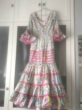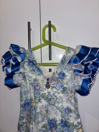 Traje de flamenca con un bonito estampado floral. Ideal para ferias y eventos. Talla 10/12 años - Mangas con volantes y detalles en azul. - Cuerpo del vestido con escote en V. - Falda larga con varios volantes. - Ribeteado en azul en los volantes de la falda.