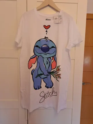 Vestido blanco con un adorable estampado de Stitch, perfecto para fans de Disney. AGOTADO EN EL MERCADO P.V.P 24€ - Diseño de Stitch con flores. - Cuello redondo. - Manga corta.