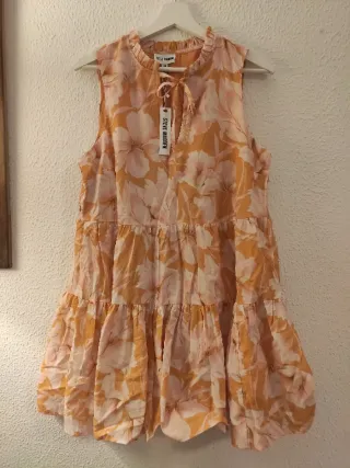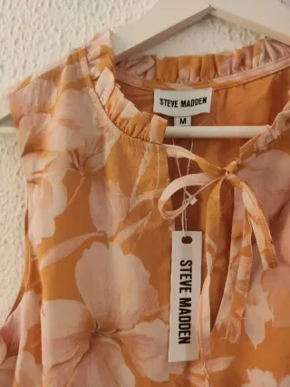 Vestido de mujer con estampado floral en tonos naranja y rosa, ideal para la temporada de verano. Diseño ligero y con volantes. - Escote con lazada. - Mangas cortas. - Falda escalonada. - Nuevo sin estrenar - Precio original 89$ - Viene de USA. California. - Marca Steven Madden