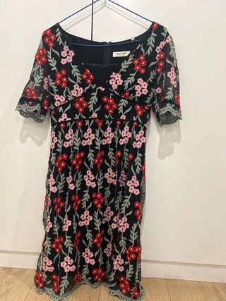 Vestido negro de la marca Almatrichi con un diseño floral bordado. - Escote redondo. - Sin mangas. - Bordados de flores y hojas en la parte superior y bajo. Precio 6.50 euros no negociables ◾ No acepto ofertas ◾ Solo venta por envios ◾ Envio en menos de 24 horas después de su compra.