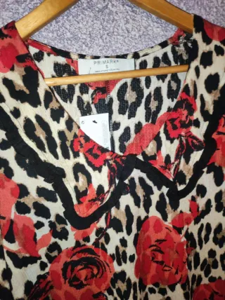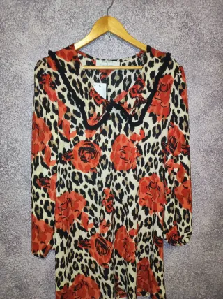 Vestido con un llamativo estampado que combina el animal print con flores rojas. - Diseño con cuello - Manga larga - Estampado mixto