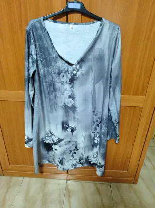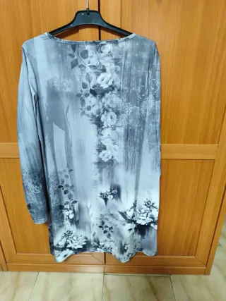 Vestido de manga larga con un estampado floral abstracto en tonos grises y blancos. Presenta un escote en V con botones. - Diseño de flores y hojas. - Cuello en V con detalle de botones.