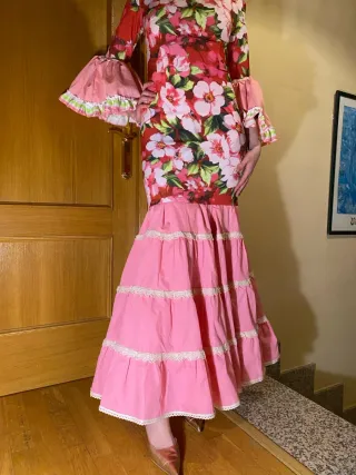 Vestido de flamenca con un bonito estampado floral y volantes. - Diseño de manga larga. - Detalle de volantes en falda y mangas.