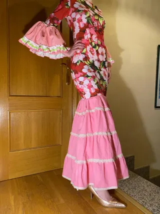 Vestido de flamenca con un diseño floral vibrante. Presenta mangas acampanadas y una falda con volantes. Talla 36 y 38 cuerpo elástico - Diseño de flores en tonos verdes y rojos. - Mangas amplias y voluminosas. - Falda con varios niveles de volantes.