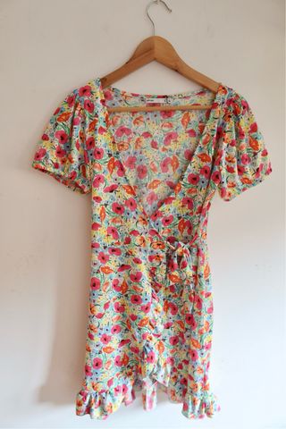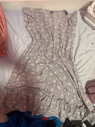 Vestido de Shein con estampado floral. - Diseño con cuello en V y manga corta. - Cintura elástica fruncida. - Bajo con volantes.