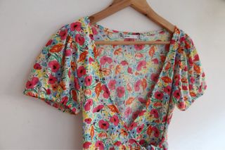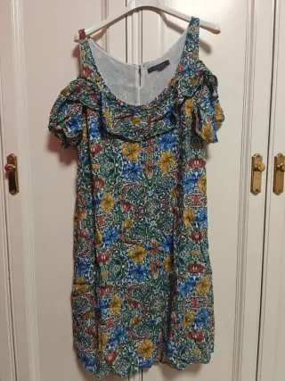 Vestido con un vibrante estampado floral. - Diseño con hombros descubiertos. - Volantes en el escote y mangas. - Estampado con flores y hojas en varios tonos. - Marca Violeta by Mango, talla S pero equivale a una L