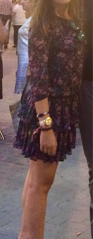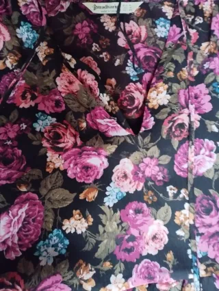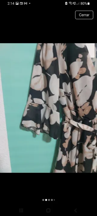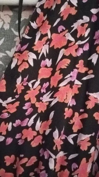 Vestido con estampado floral de la marca CORTEFIEL. - Diseño con fondo negro y flores en tonos rosas y azules. - Mangas francesas y volantes en la parte inferior. - Tejido ligero y vaporoso.
