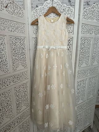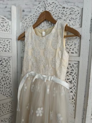 Vestido de comunión elegante con detalles delicados. Como nuevo (usado solo una vez). Medidas : Contorno de pecho : 90 cm Contorno de cintura : 80cm Largo de vestido : 120 cm PRECIO NEGOCIABLE - Cuerpo de encaje blanco. - Fajín de lino beige con apliques florales. - Falda de tul vaporosa.