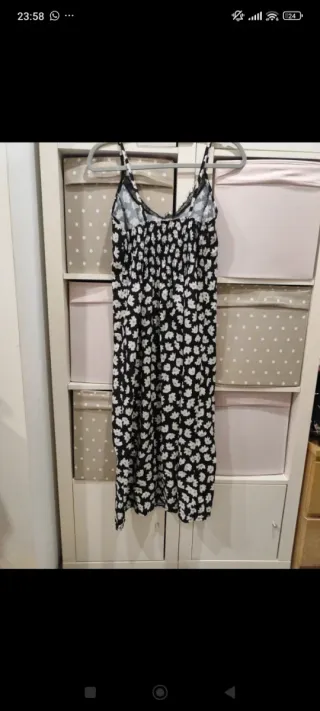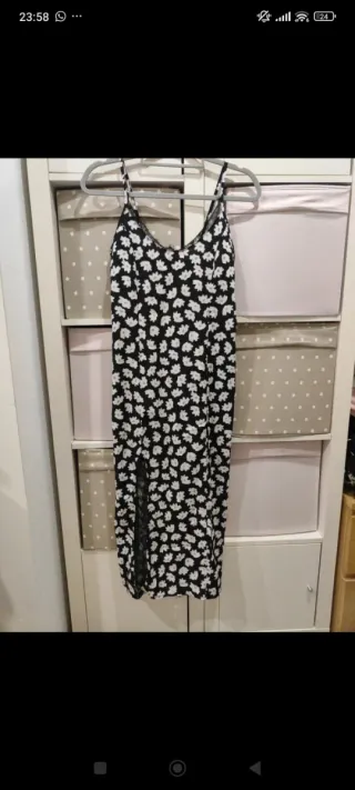 Vestido de tirantes con un bonito estampado de flores sobre fondo negro. Presenta un diseño elegante y fresco, ideal para diversas ocasiones. - Tirantes finos. - Escote con detalle de encaje. - Abertura lateral.